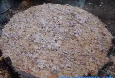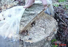 Z micelijem na žitnem zrnju Micelij na žitnem zrnju potresemo po celi površini odrezanega dela panja. Po miceliju je priporočljivo potresti plast sveže žagovine, na katero položimo odrezan del panja (Skica 5), nato pa vse skupaj zaščitimo pred sončno pripeko in pretiranim izsuševanjem s folijo za živila ali polivinilom (Slika 15, Slika 16).