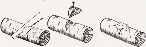 Micelij na žitnem zrnju lahko prav tako natresemo v zareze v obliki črke V ter vanje nato vstavimo izrezani del debla (Slika 9). Po potrebi odrezani del debla pritrdimo z žebljem ali vijakom ter zaščitimo pred izsuševanjem s folijo za živila ali polivinilom (Slika 10, Skica 3).