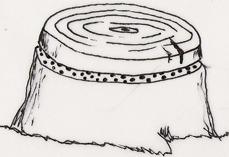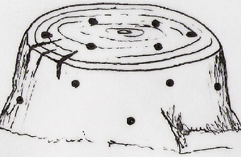 Z micelijem na čepkih Navrtamo luknje po celem obodu panja, vanje vstavimo micelij na lesenih čepkih (Skica 4) ter zaščitimo pred izsuševanjem. V tem primeru je najbolje uporabiti čim večje število čepkov. Za ta namen niso primerni panji, iz katerih se še vedno izceja sok. Če želimo uporabiti tak panj, je najbolje, da počakamo, da se osuši ter ga šele nato inokuliramo z micelijem.