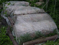 Inokulacija lesa s pomočjo micelija na žitnem zrnju Debla narežemo na krajše kose (Slika 5), med katere po celotni površini natrosimo plast micelija na žitnem zrnju in sveže žagovine, ki jo dobimo ob žaganju debel (Slika 6). Vse skupaj zaščitimo pred izsuševanjem s folijo za živila (Slika 7, Slika 8), konce debel pa prav tako premažemo z voskom ali parafinom (Skica 2).