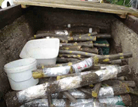 Čepke popolnoma vstavimo v luknje. Potrebno število čepkov je razvidno iz tabele 1. Odprtine zapolnjenih luknjic premažemo s staljenim parafinom ali čebeljim voskom (ne s cepilno smolo!). Prav tako premažemo konce debel, da preprečimo vnos nečistoč in izhlapevanje soka iz njih (Slika 3, Slika 4).